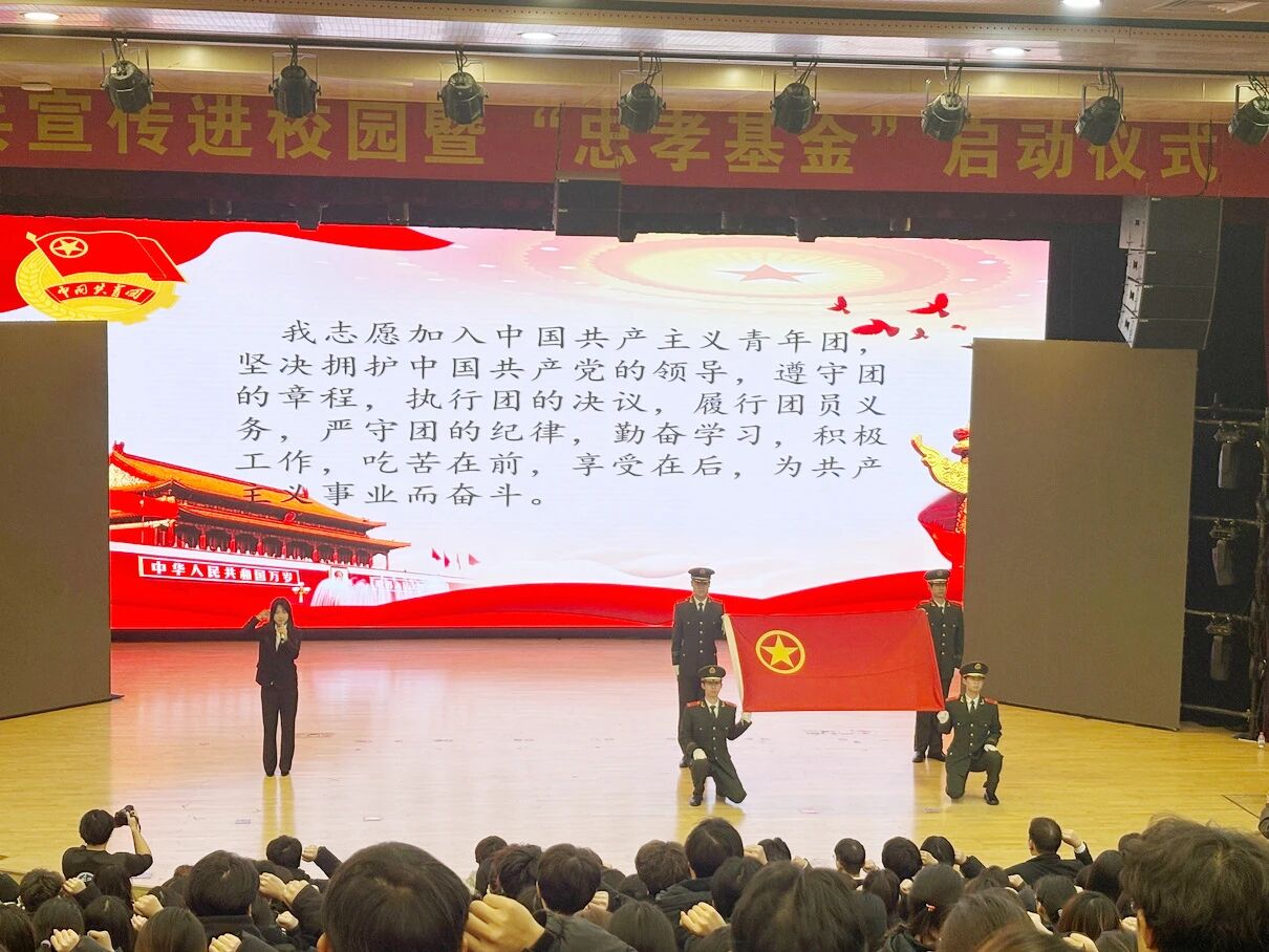 宣誓环节中,优秀团员代表刘佳田禾领诵入团誓词,全体新团员佩戴团徽、高举右拳,面向团旗庄严宣誓,誓言庄重有力。