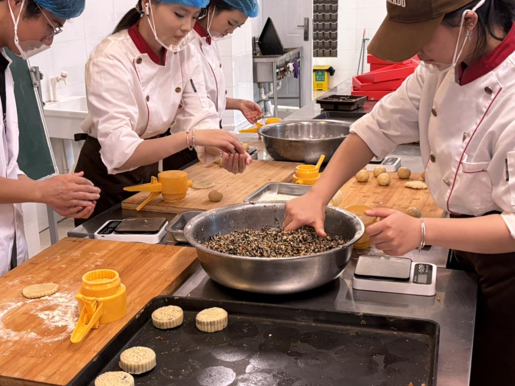 在“小老师”的耐心指导与校院团学组织工作人员的协调配合下,同学们的参与热情持续高涨。大家围拢学习,紧跟演示步骤投入实践,从揉面力度的把控到馅料位置的调整,从包馅手法的锤炼到压模角度的校准,每一个环节都凝聚着专注与用心。普通的食材在巧手下逐渐蜕变,一个个纹路清晰、模样精巧的月饼应运而生,成为大家用心创作的节日作品。